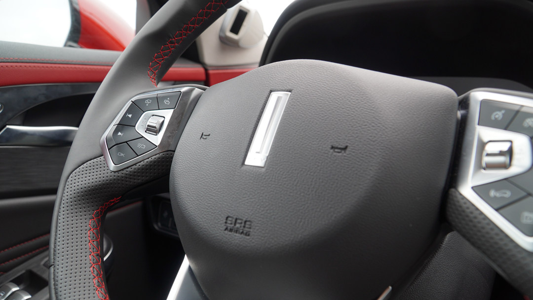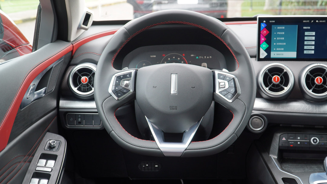 平底的方向盘运动化特征明显,而且方向盘上有较多的功能按键,按键面积较大,不容易出现误触的情况。但是有一点值得注意,WEY操作显示屏的多功能菜单逻辑需要改进,菜单翻页、上下调整以及确认按键如果能够重新编排或者使用拨杆来调节,相信会更加人性化些。