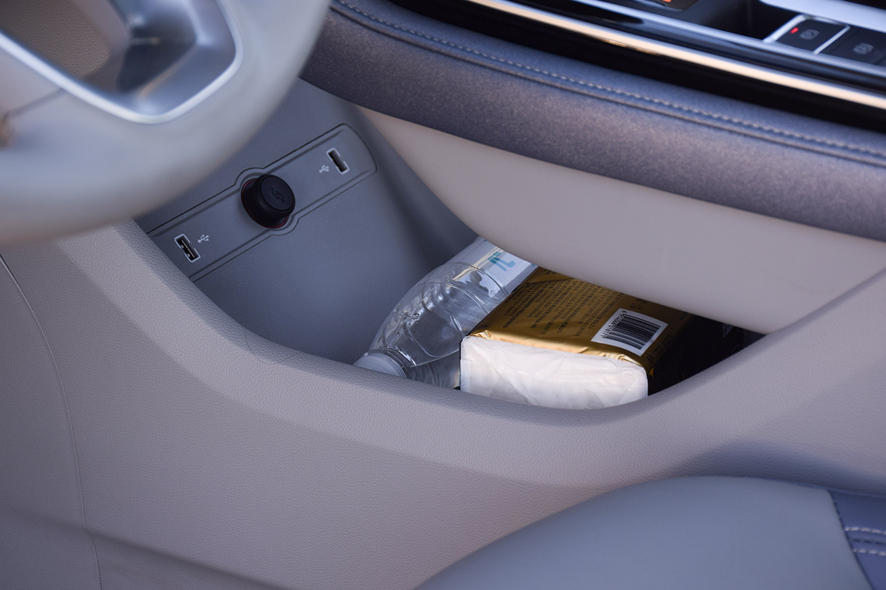宽大的中央通道不仅带来了很好的人机工程学体验,也增强了内饰的豪华感。下方还有一块很大的储物空间,实用性不错。