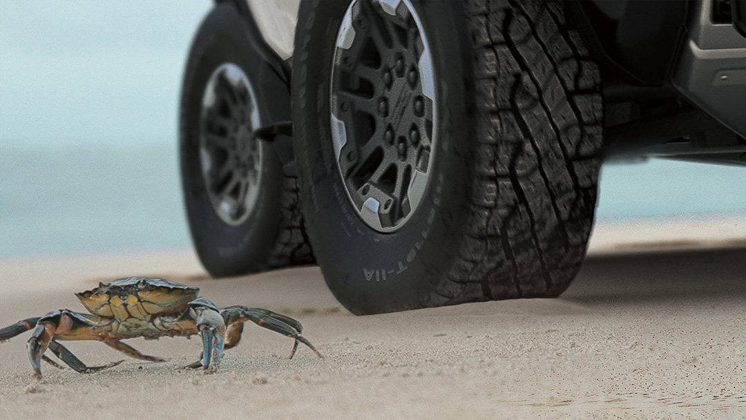 像螃蟹一样横行无忌听着是不是很酷,为此悍马EV还为此专利申请了螃蟹标。本身燃油悍马的越野能力就极强,复活了的电动悍马如果不能超越前者,还真说不过去。
