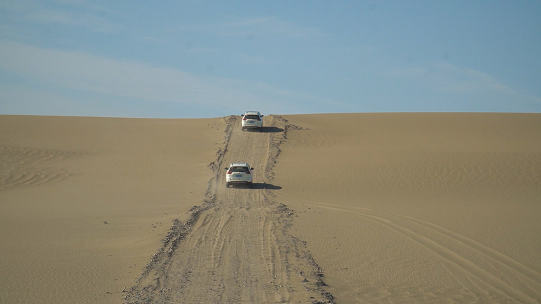不过在遇到坡度比较大的沙丘时,还是需要切换至LOCK四驱锁止模式,在此模式下,奇骏对这些坡度更大的沙丘明显更加得心应手,当然,这副QR25发动机+CVT变速箱也给奇骏提供了不错的动力储备,这使得我们在穿越中并没有出现陷车的情况发生。
