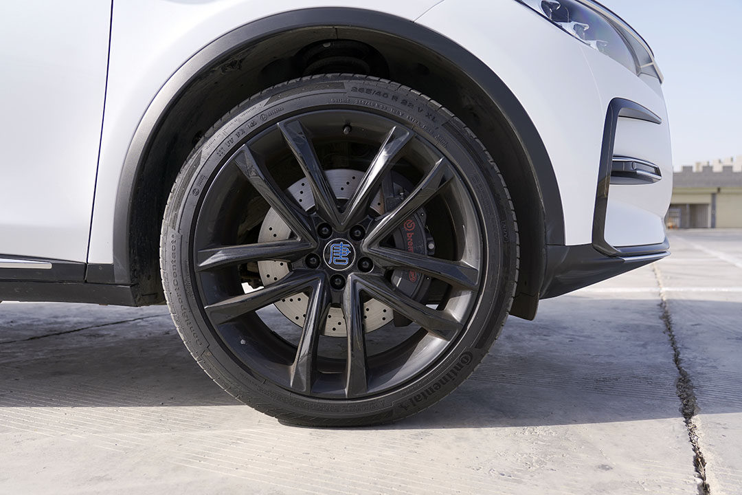 2021款唐DM也并非完美,由于要兼顾性能的原因,原厂使用的265/40 R22规格的马牌轮胎虽然尺寸足够大,造型也足够酷炫,接受路面反馈的能力和侧向支撑也很强,但是过低扁平比一定程度上也导致了车辆对于振动过滤不足,因此中高速的时候舒适性比较一般。