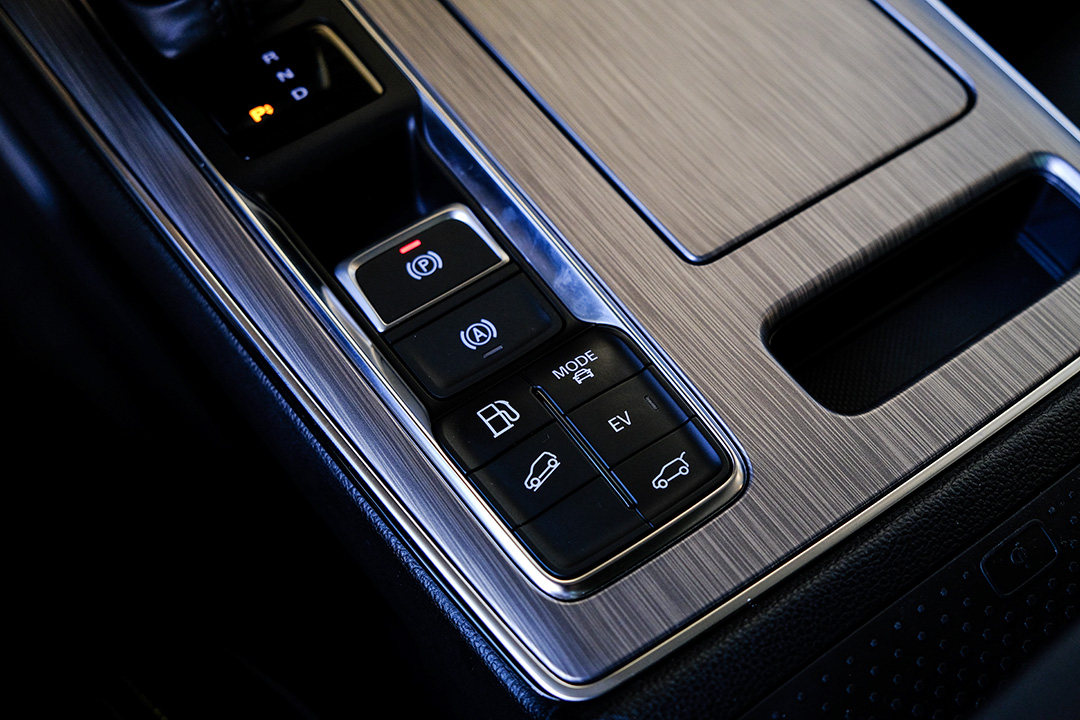 在挡把的左下角区域可以自由选择驾驶模式,纯电模式只需要按一下“EV”键即可,“MODE”键可选择ECO、COMFORT、SPORT三种模式。模式虽多,不过各模式之间的差别其实并不大,对于普通消费者来说,即便是ECO模式,爆发力就挺强悍的,反而没有纯汽油车的那种无力感。