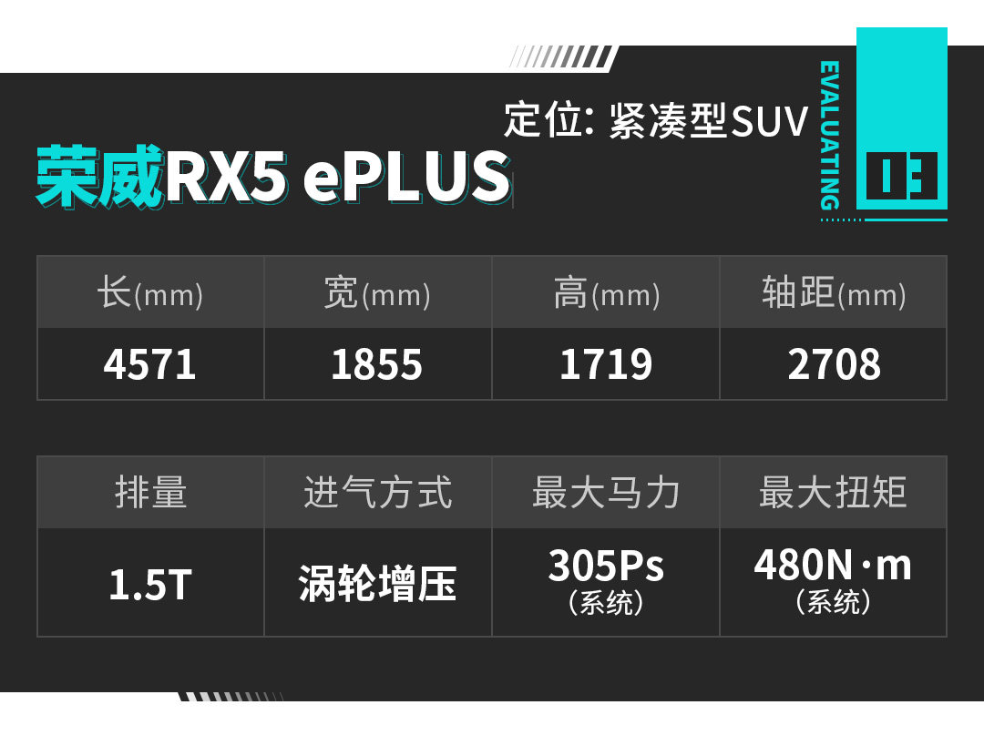 荣威RX5 ePLUS 搭载的是1.5T 缸内中置直喷涡轮增压发动机+高效永磁同步电机组成的插电式混合动力总成,系统综合马力达到305Ps,综合扭矩达到480N·m。所以你会看到荣威宣称这套系统媲美3.0T发动机,并不是吹牛的表现。
