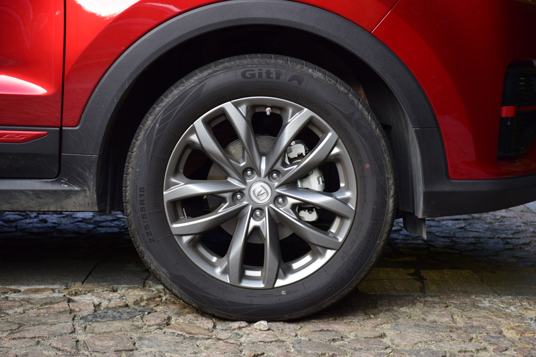 枪灰色的轮毂跟红色的车身非常搭调,轮胎使用佳通GitiComfort F50系列,尺寸为225/55 R18,相比起目前大多数车型使用的诸如米其林、马牌等高端轮胎相比,CS55 PLUS蓝鲸版使用佳通轮胎似乎差点意思。