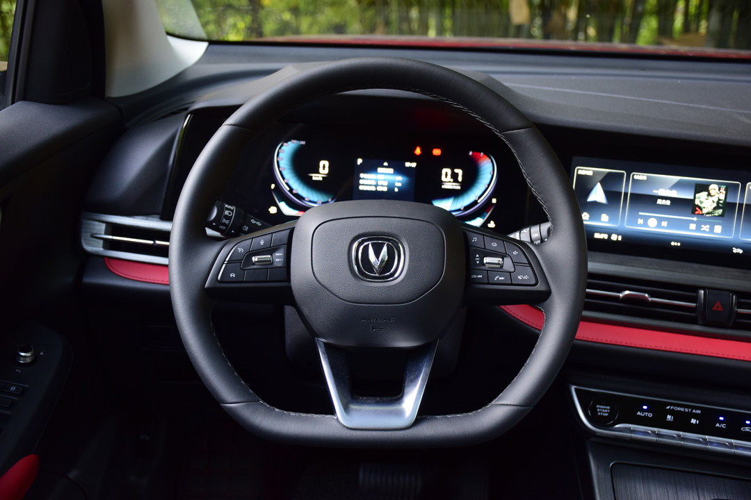 方向盘使用了新的设计,平底化的设计同样是为了运动感服务,目前主流的方向盘都是使用小气囊、多镂空的设计风格,CS55 PLUS蓝鲸版也不例外。而且,如果想要快捷调节多媒体系统的音量,只能通过方向盘上的音量调节按钮调节,在中控没有找到旋钮或者按键调节,如果能够增加音量调节实体按钮,相信会更加实用些。