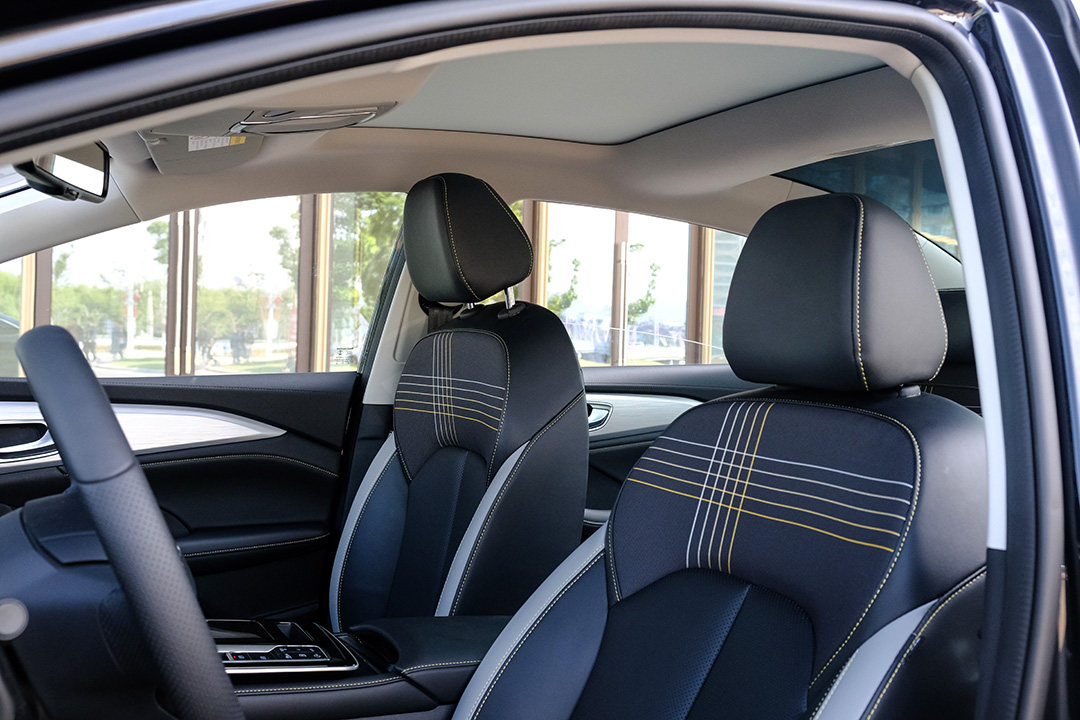 荣威ei6 MAX的用料比较厚道,中控台、车门板处采用了大量的皮革材料,再辅以木纹饰板装饰和荧光黄的缝线工艺点缀,内饰的质感非常棒。