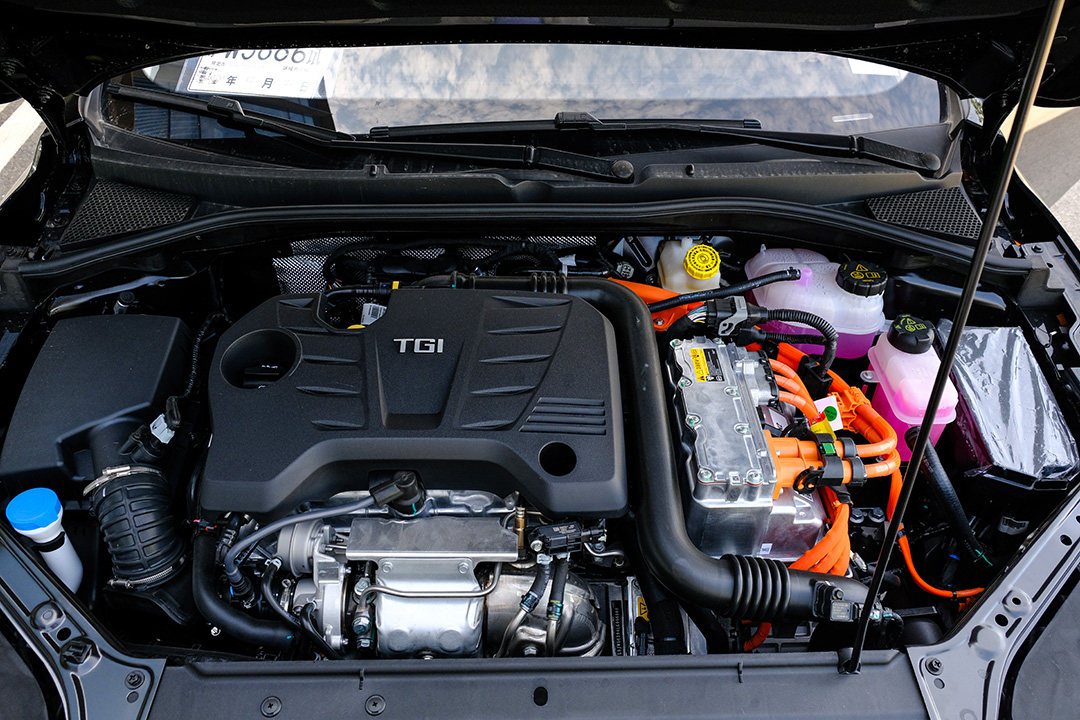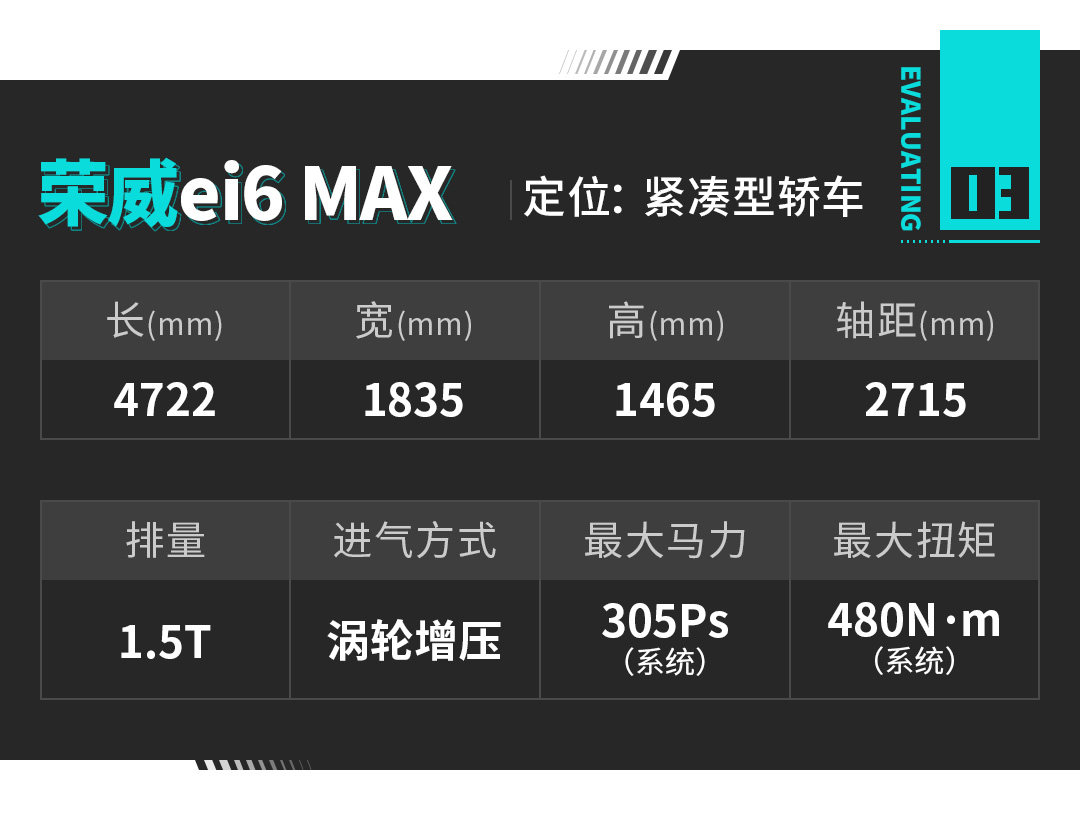 荣威ei6 MAX搭载的是1.5T 缸内中置直喷涡轮增压发动机+高效永磁同步电机组成的插电式混合动力总成,系统综合马力达到305Ps,综合扭矩达到480N·m,系统性能媲美3.0T发动机,官方百公里加速7.2秒。