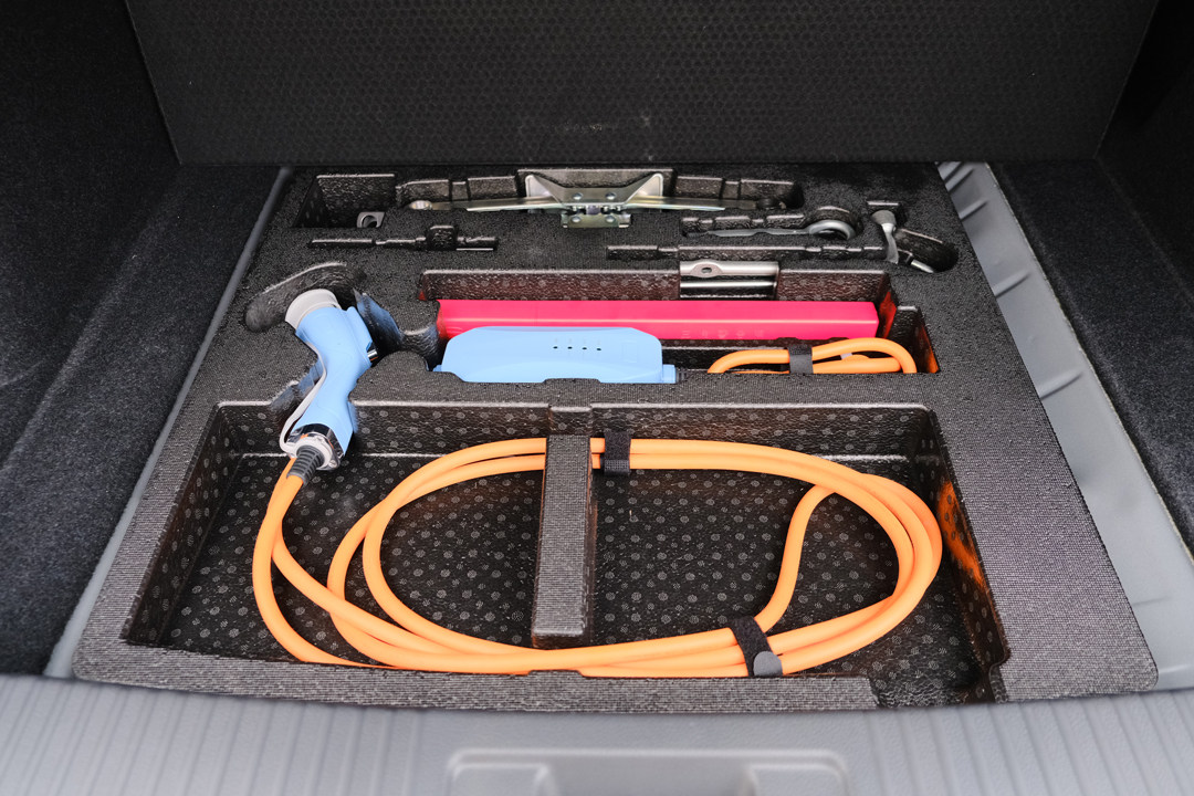此外,后备厢盖板下方还有一个规整的置物槽,放置着千斤顶、家用充电线等随车工具。但美中不足的是,在放倒后排座椅后会形成一个较高的台阶,整体平整度一般。