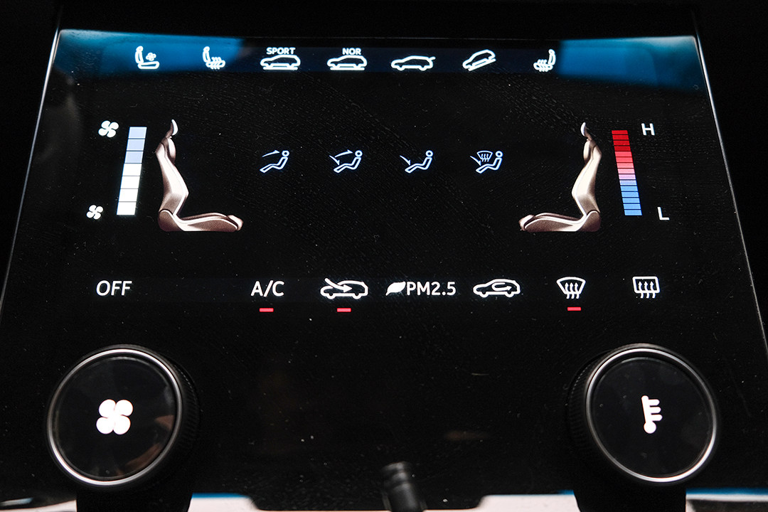 而在这里顶配车型上,一共有3块屏幕,空调控制区采用了全触控控制,也把驾驶模式、陡坡缓绛和座椅加热等功能集成在这款触摸屏上,而且触控有物理反馈,体验细节到位。