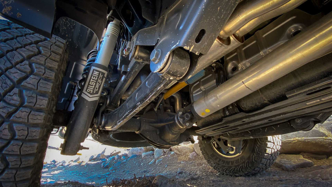 RAM 1500 TRX能够做这种动作,离不开其彻底重新设计的底盘,与普通版相比,整体有74%的部件是不通用的。来自Bilstein的Blackhawk主动式减震器阻尼力能够在22-2000磅之间调节。后弹簧的高度为67.5cm,是世界上最高的量产车,为TRX量身定制。