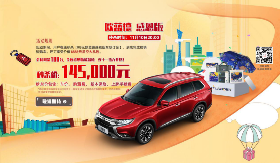 适逢双十一到来之际,广汽三菱还为广大消费者准备了终极“麻辣十重礼”。即日起,仅需14.5万即可全包闪购欧蓝德,电商平台专供100台限时抢购。11月7日或14日到店还有机会抽取49999元购车抵扣券和200-5000面额油卡。11月1日至11日期间,订购欧蓝德、奕歌、劲炫车型,享受交1000抵2000“翻倍礼”;电商平台下订车型还可享受1000元购车抵扣券、价值1888元文创礼包等惊喜好礼。此外还有多重换购补贴、多项金融服务等丰富福利,更多优惠详情请咨询当地经销店。