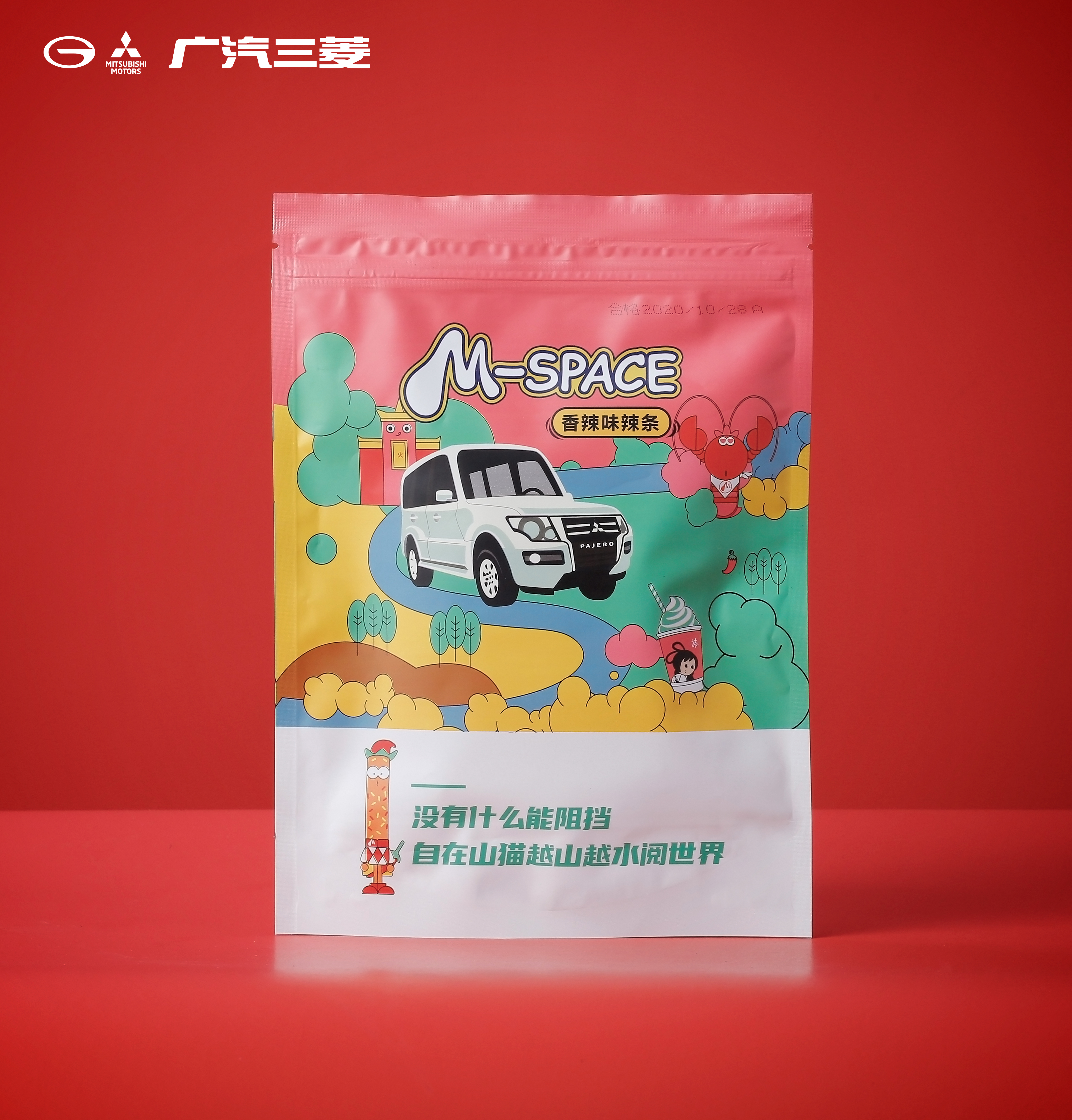 在现场,广汽三菱也正式公布了此次推出的跨界新品——广汽三菱辣条,并将其命名为“SPICY ENERGY BAR”,把畅享辣趣的四大口味场景与品牌四大明星车型相结合,完美诠释了激发生活创造力的“辣能量”。