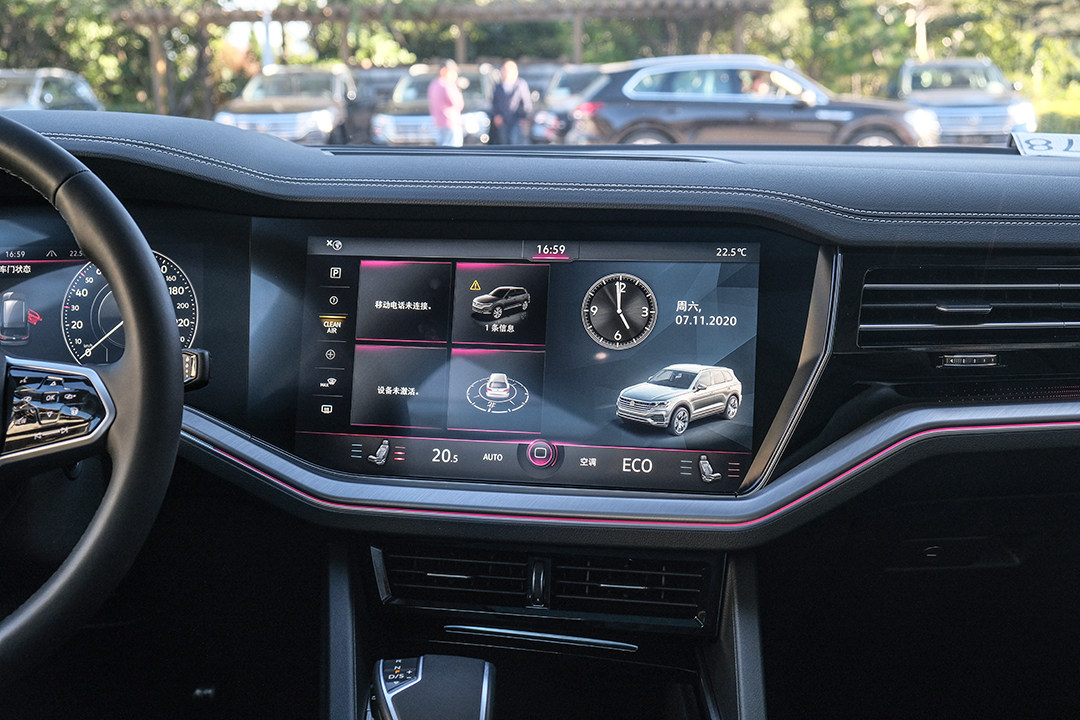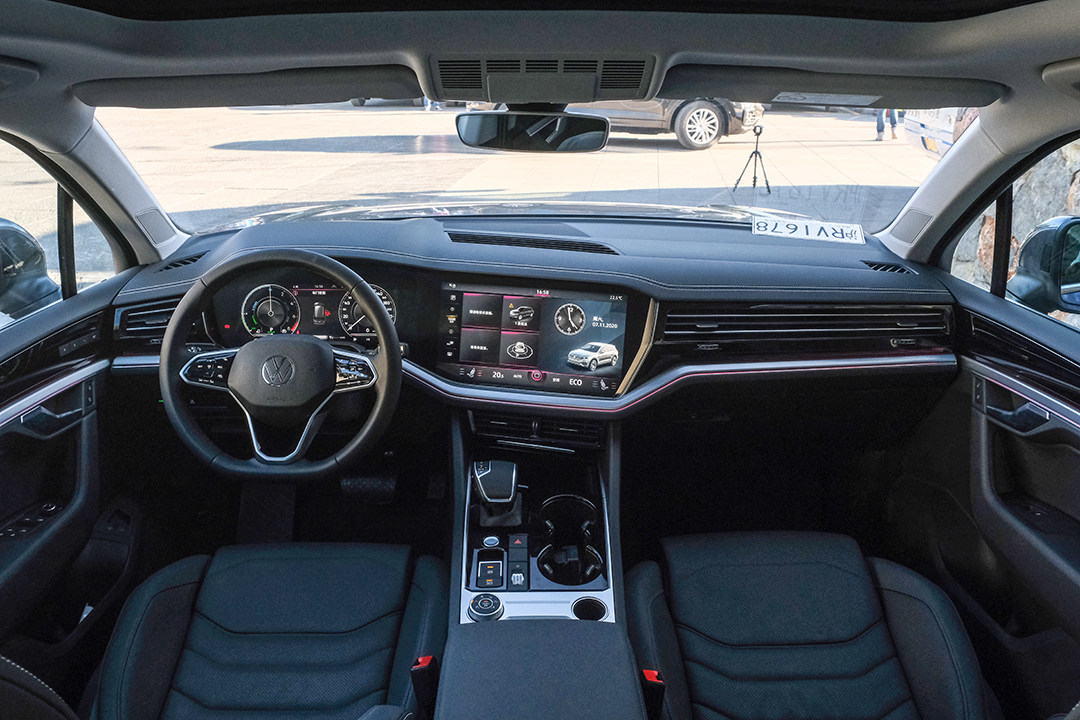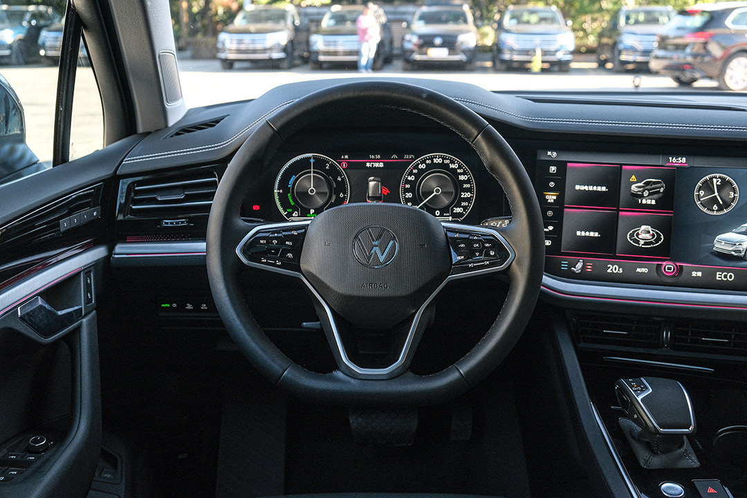 2021款途锐换装了全新的方向盘设计,汽油版和插混版一样,采用全触控控制,具有按压反馈,操作的手感和反馈感都非常出色,整个车厢环境有非常强的科技感。