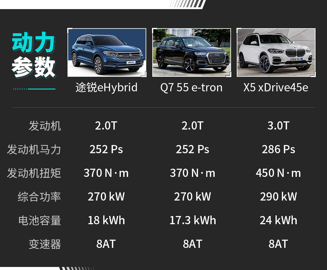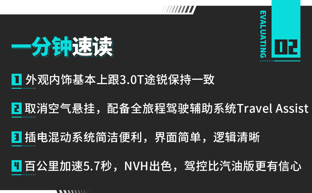 首先,这套动力总成是大众品牌目前为止投放在中国市场的SUV当中,加速性能最强悍的一台;其次,这套2.0T发动机+电机组合,比这一代的3.0T发动机、上一代的4.2L V8发动机要快,甚至比第一代的6.0L W12发动机还要快!