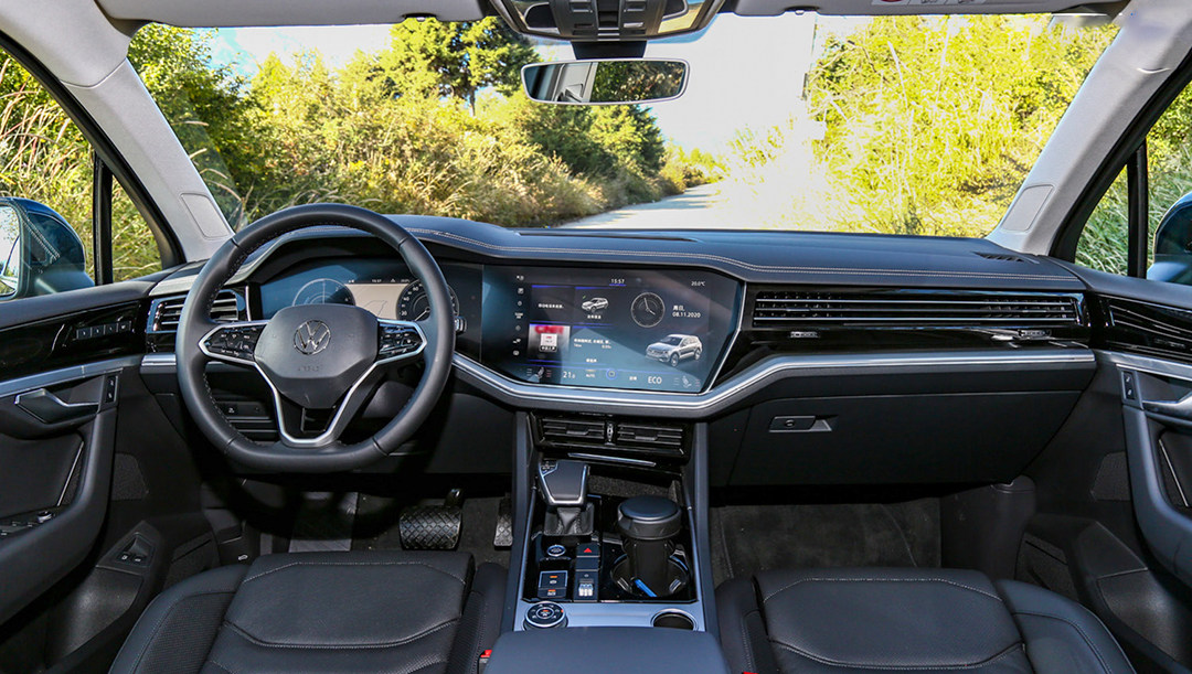 敞开车门,进入车内,可以发现途锐PHEV整体设计风格非常新鲜。不拘一格的全新设计,层次感鲜明,给人耳目一新的感觉,而大量横向线条的使用则拉宽了整个内饰的横向视野。