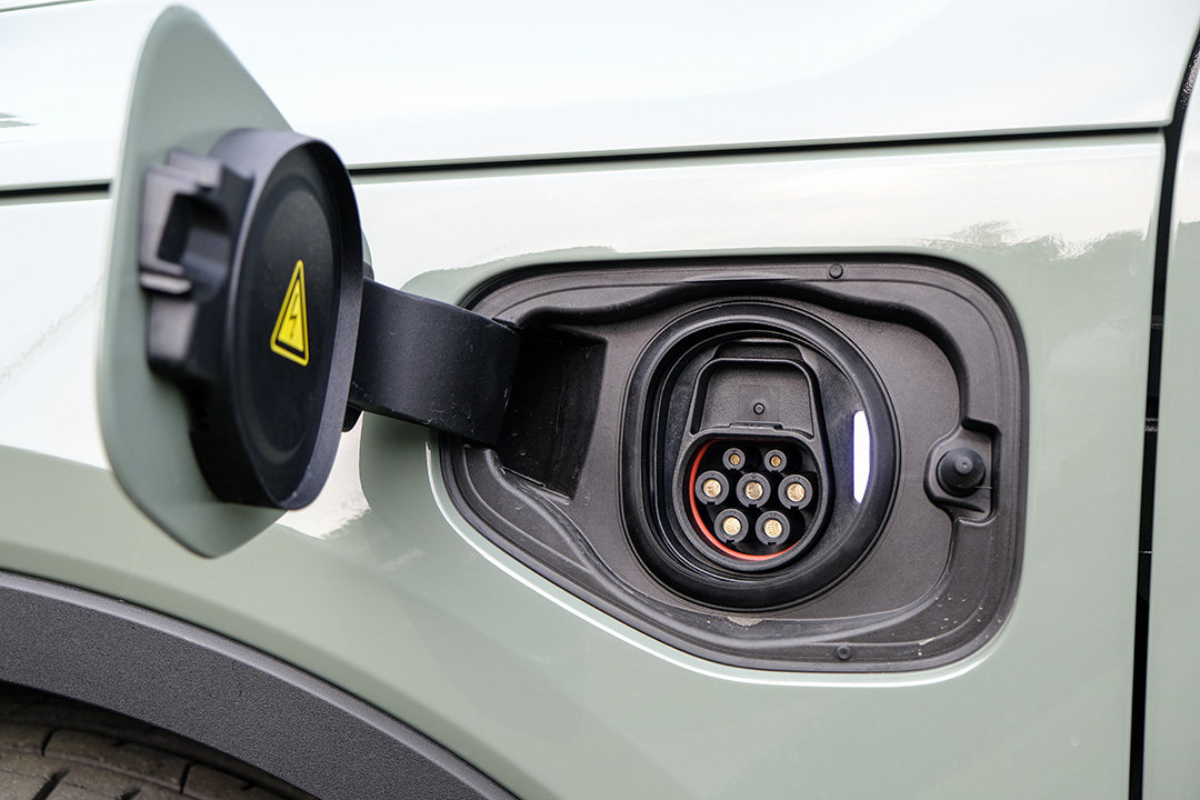 侧面最明显的地方就是前后翼子板处的快充、慢充口,这是其纯电动车身份的象征。