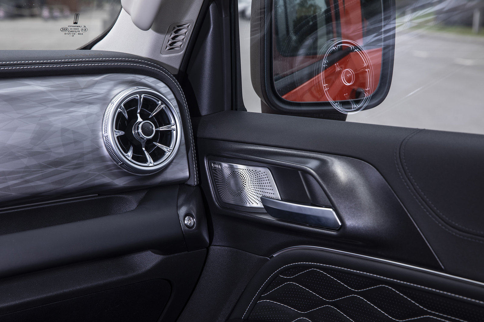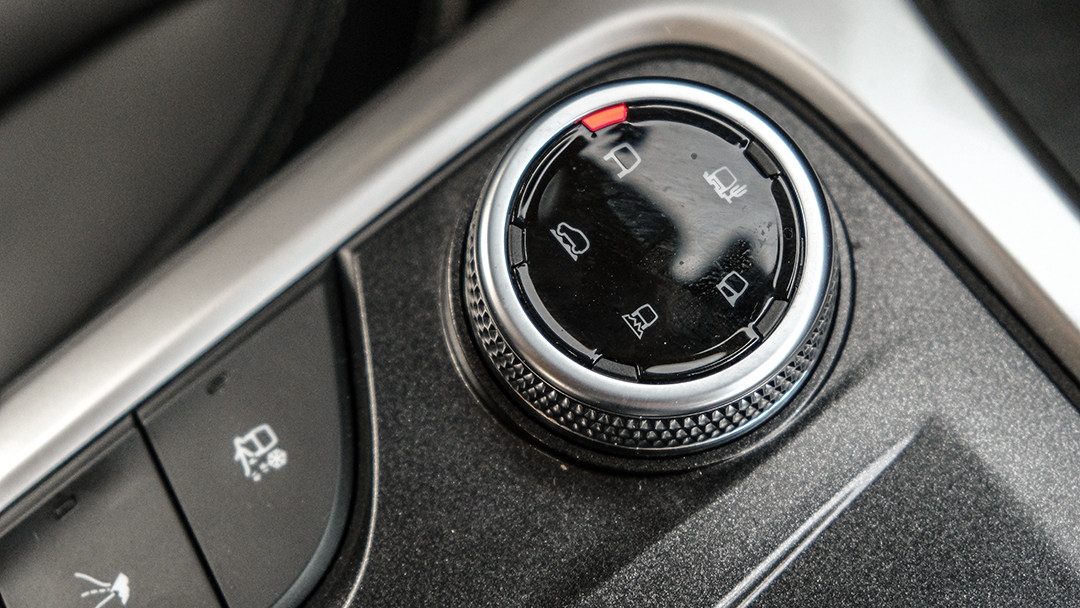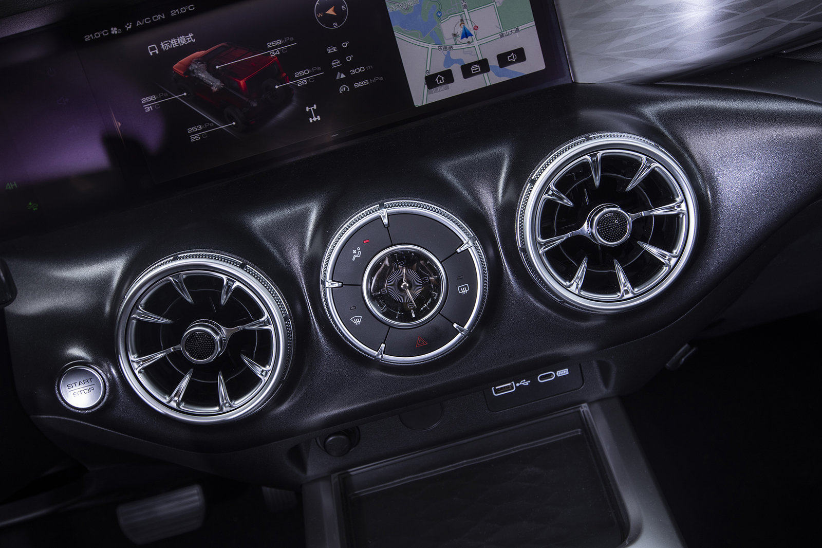 虽然A柱、副驾前方都有非常粗壮的拉手,整个布局也是典型的硬汉风格,但车内不会看到太多棱角分明的地方,还是以圆角设计为主,圆形出风口再加上双12.3英寸联屏。