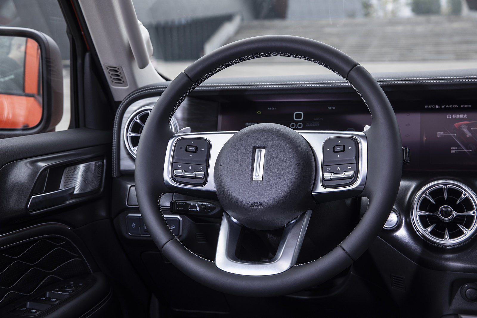 内饰呈现出更多的是一种“文明”的感觉,中控台、扶手位置的皮革材料也让内饰有一丝豪华的气息;方向盘造型则稍显中庸,按键和布局都比较简约,也比较契合坦克300实用至上的硬派越野产品定位。