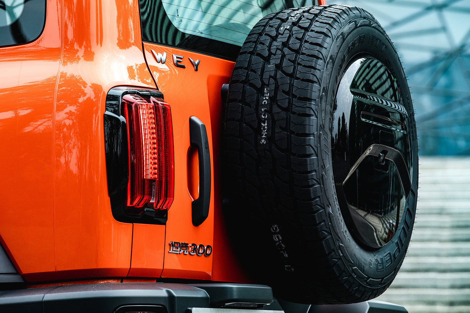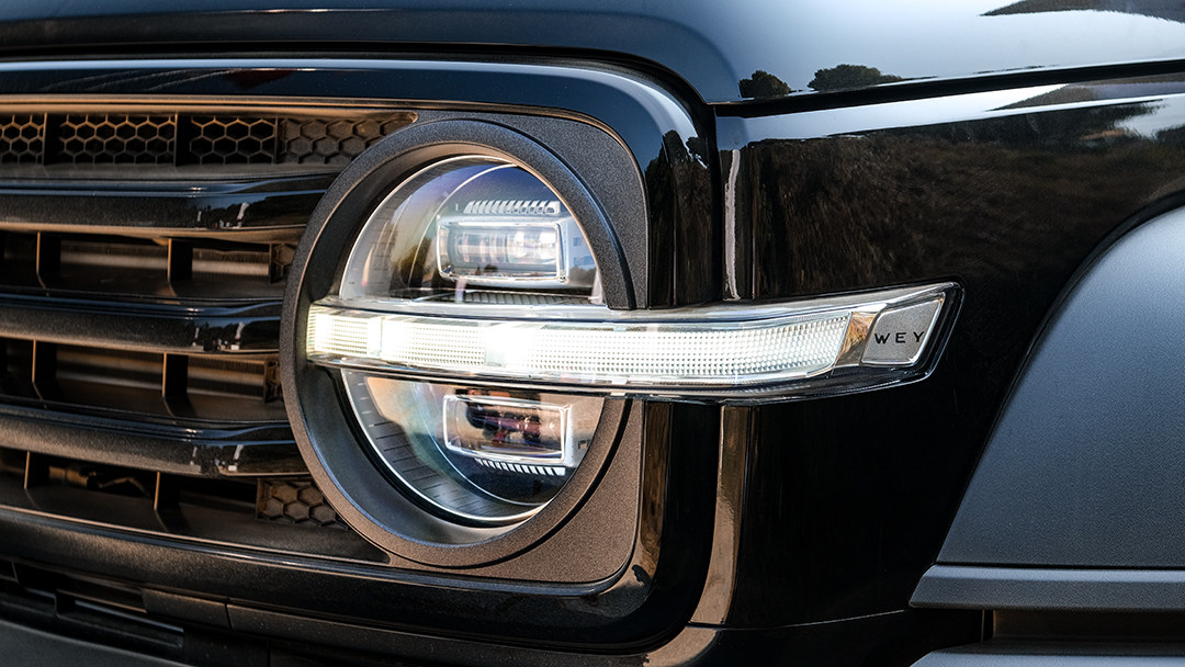 另外坦克300也融入自身的一些设计,大圆灯中间加入了条形LED灯,尾灯也是条形灯带,契合WEY的LOGO造型。