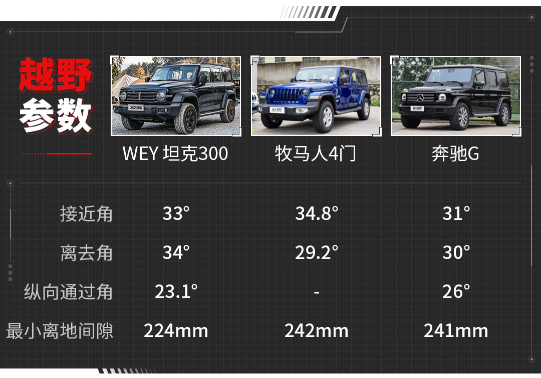 坦克300的通过性称得上强悍,得益于非承载式底盘,拥有33°接近角、34°离去角、23.1°纵向通过角,最小离地间隙可达224mm,最大爬坡度可达70%,以及700mm原厂涉水深度。接近角离去角比奔驰G级还要大,跟牧马人也非常接近。