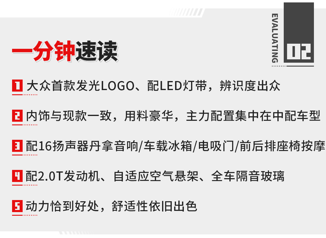 新款辉昂带来了的改动其实还挺多,外观能呈现出大众未来的设计方向,想必未来会有更多大众品牌车型采用发光的LOGO与贯穿灯带,也把空气悬架、丹拿音响、车载冰箱等下放到更低门槛的车型,都非常有诚意。