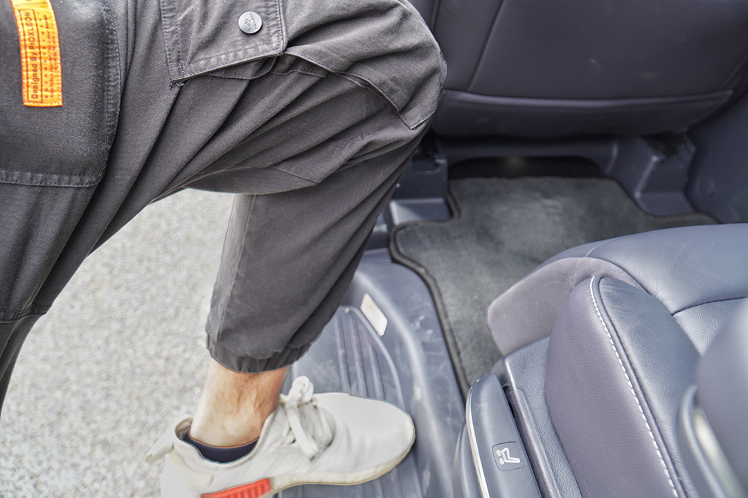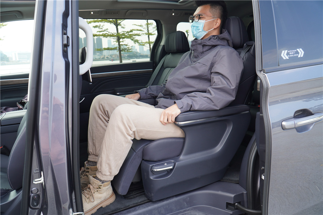 由于地板下部要给滑轨槽留出空间,所以为了方便后排乘客从容的上下车,门槛上还有一个小台阶设计,这样无论是上下车,都会更加方便。但即使是这样,传祺M8还是有着较高的地台,1米72测试者上车,膝盖弯曲差不多达到90度,要是经常接送老人,可能没这么方便。