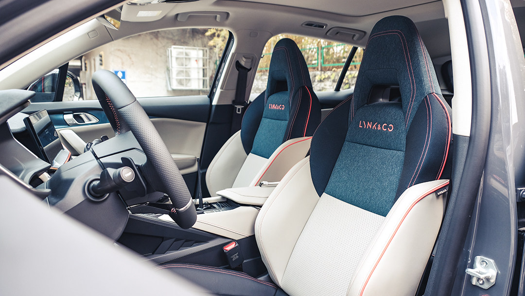 此外,领克06的座椅还采用了皮质与类似牛仔布的织物拼接的包覆方式,并且通过鲜艳的橙色缝线勾勒座椅造型线条,视觉效果极佳;前排座椅在侧向支撑性方面也有着不错的表现,不过由于座椅仅支持两向高低调节,因此对于喜欢较低坐姿的驾驶者(比如教授)来说,较难找到一个最合适的座椅设置。