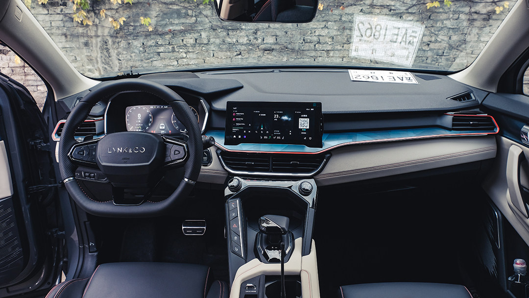 在教授看来,内饰是领克06最令人感到惊艳的部分,全新的中控台设计采用了非常硬朗的轮廓线条,立体感强烈的内饰构件使内饰获得了非常强烈的层次感;而在包覆材料方面,本次教授试驾的这款耀Halo版车型采用了黑色、米白色与蓝色拼接的内饰配色方案,看上去颇为清新,使新车座舱在视觉上显得更加新潮、时尚。