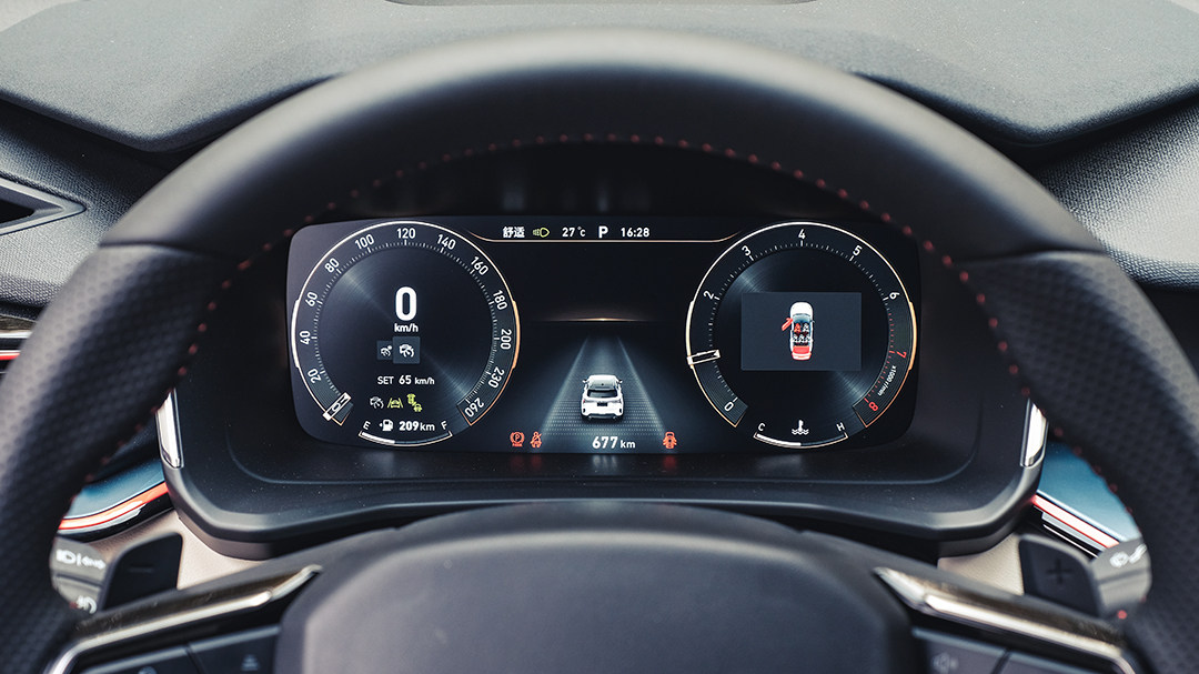 在驾驶者正前方的液晶仪表尺寸与中控触摸屏一样达到了10.25英寸,表盘风格可根据驾驶者喜好进行切换。通过新加入的“三指飞屏”功能,驾驶者可以随时将导航界面投射至仪表盘并进行全屏显示,此时便可在中控触摸屏上进行其他页面操作;这确实是一个相当实用的新功能。