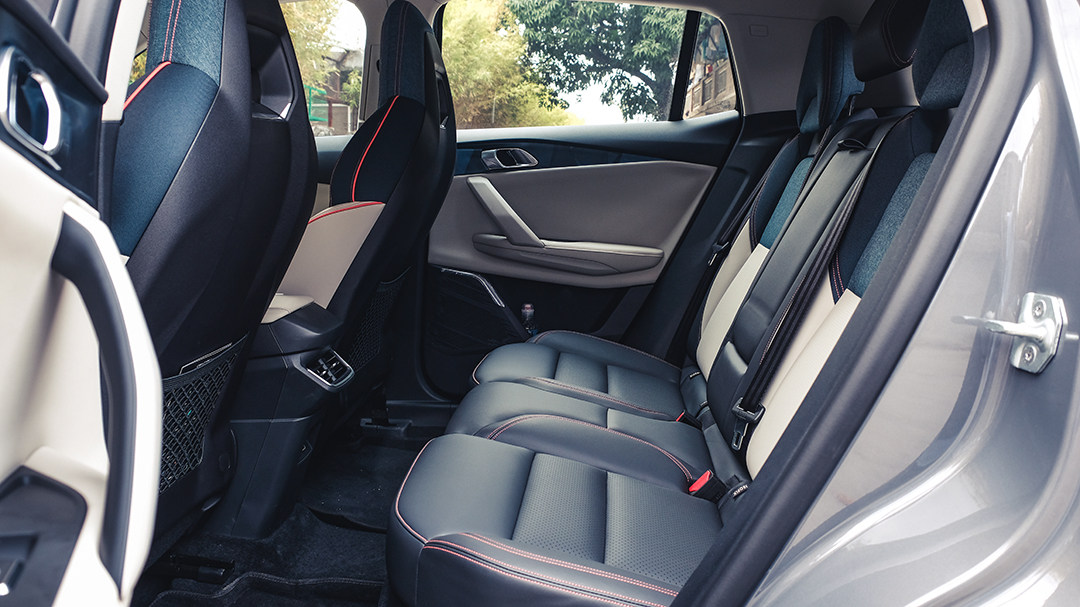 而在后排,由于领克06的轴距仅有2640mm,后排乘客当然不会拥有相当充裕的腿部空间,尽管在图片中领克06的后排展现出了不小的腿部空间,但这其实是较短的座垫带来的视觉“假象”。尽管后排座椅靠背的倾斜角度不算小,后排乘客可以获得一个比较舒适的坐姿,但由于座垫较短导致对腿部支撑的不到位,在长时间乘坐后,乘客仍有较大可能出现腿部疲劳的情况。