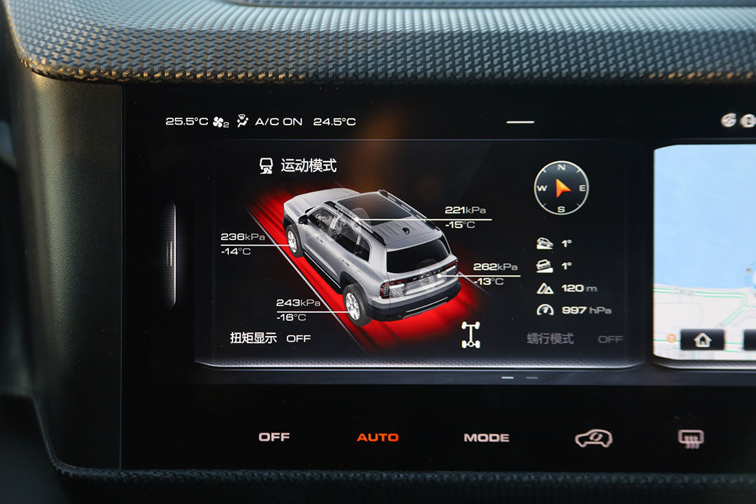 另外2.0T车型还增加了一套“越野UI”,通过系统,我们可以轻松了解车辆的驾驶模式、倾斜角度、转向角度、四驱系统和差速锁的工作状态等。