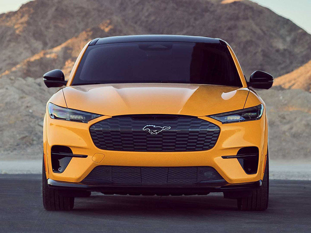 这么看来是不是Mustang Mach-E更得人心呢?再来看一下GT版有何不同吧!GT版中网使用了比普通版更加光滑的灰色碳化设计,标配19寸轮毂+红色卡钳(20寸轮毂要选装),轮毂的样式比普通版更加运动。整体而言,GT版要比普通版更为运动。