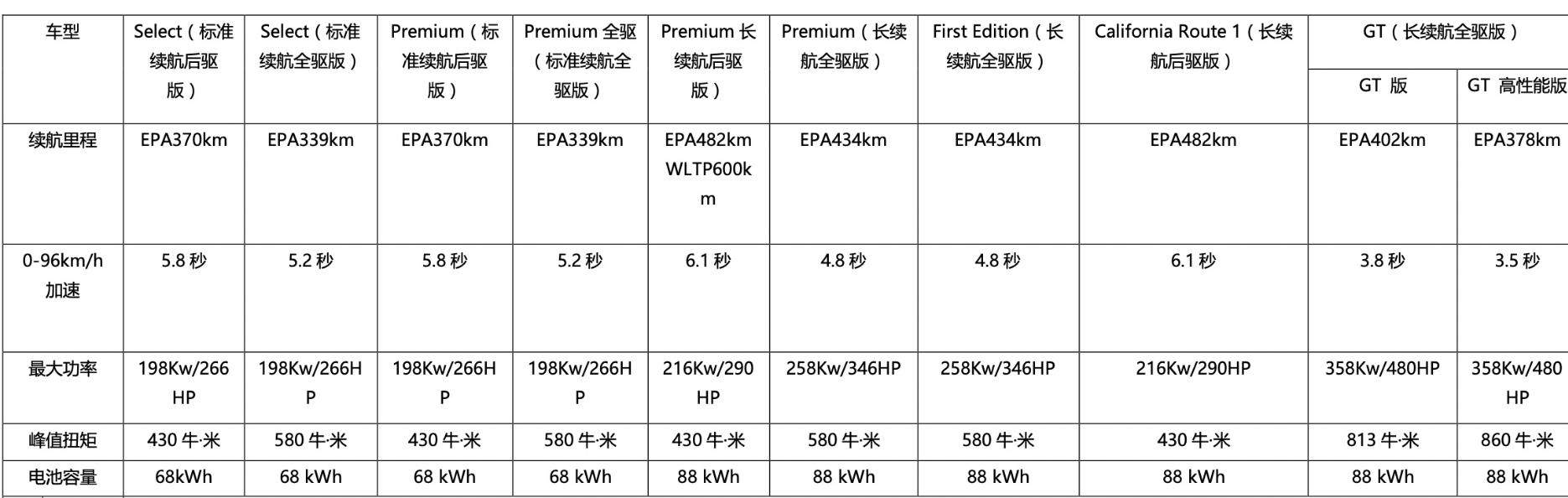 如图所示,GT高性能版车型的最大功率达到了486Ps,峰值扭矩达到了860N·m,百公里加速仅3.5秒。普通版车型的加速也并不慢,最慢的也才6.1秒,妥妥的性能出众。