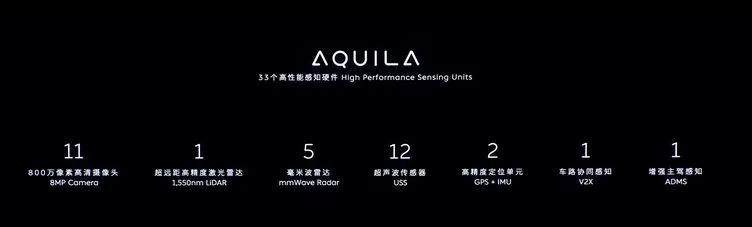 蔚来超感系统Aquila配备了33个高性能感知硬件,其中包括11个800万像素高清摄像头、1个超远距离高精度激光雷达、5个毫米波雷达、12个超声波雷达、2个高精度定位单元、1个车路协同感知和1个增强主驾感知,每秒可产生8GB图像数据。
