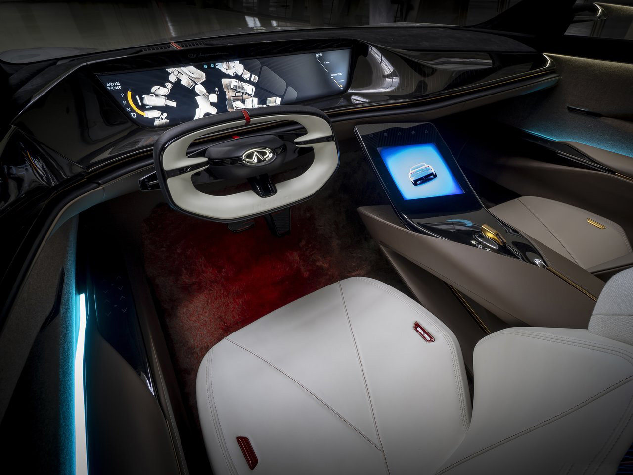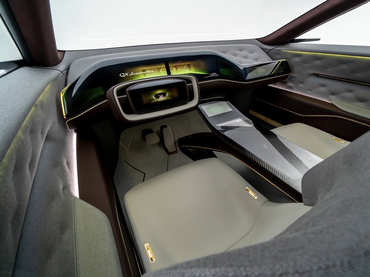 QX Inspiration的内饰自然也是和Qs Inspiration有着异曲同工之妙,硕大的显示屏异常显眼。不过QX Inspiration的内饰采用了大量的翻毛皮包裹,豪华感更强。