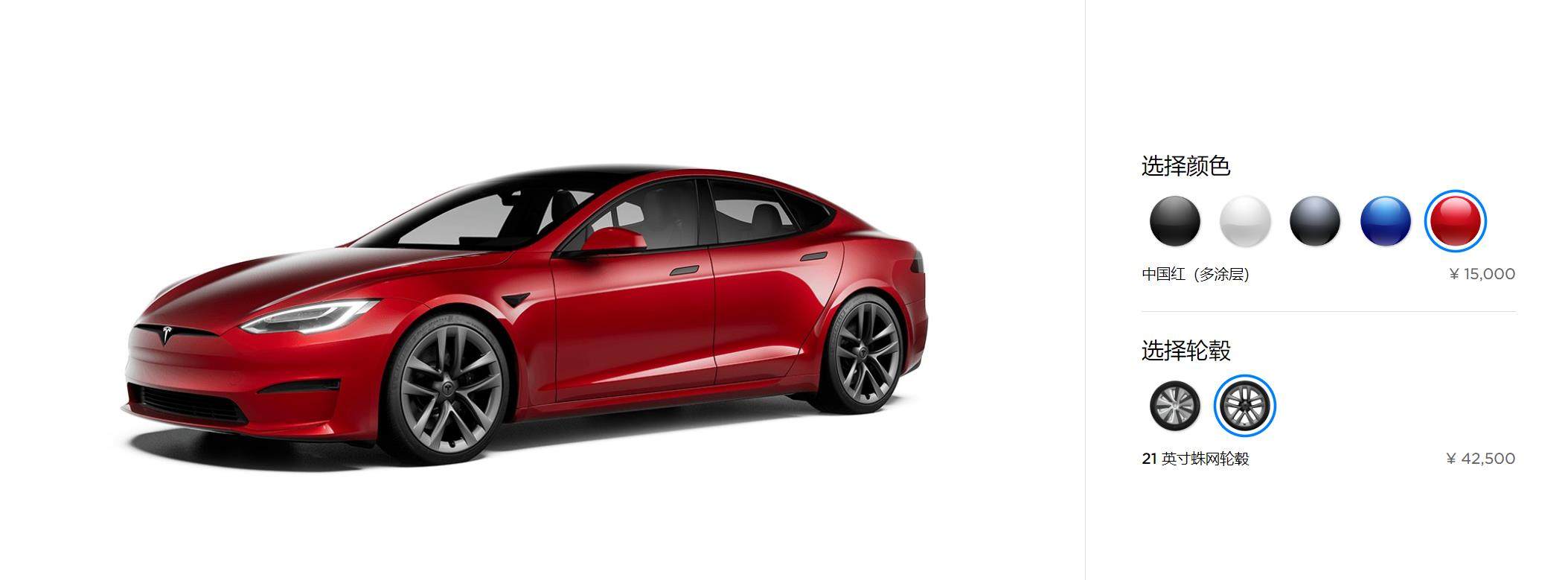 新款Model S还提供纯黑色、珍珠白(多涂层)、冷光银、深海蓝、中国红(多涂层)共5种外观颜色选择。除了纯黑色涂装,其他四种外观颜色均需要15000元进行选装。