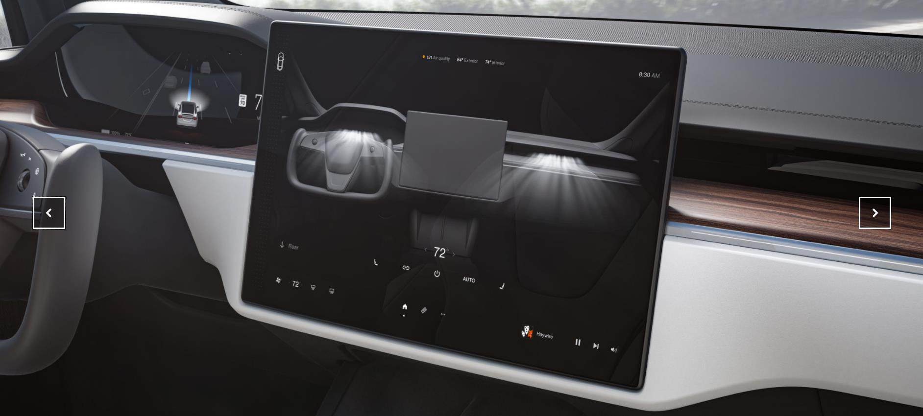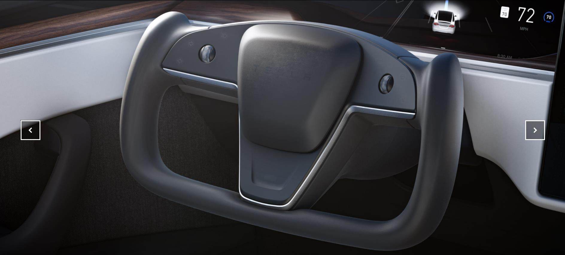 方向盘上比现在Model 3更为简洁,取消了拨杆,灯光和雨刮的控制集成在了方向盘上,挡位切换则需要到中控屏上进行操作。新用户可能需要花费比较多的时间才能接受这样的设定。