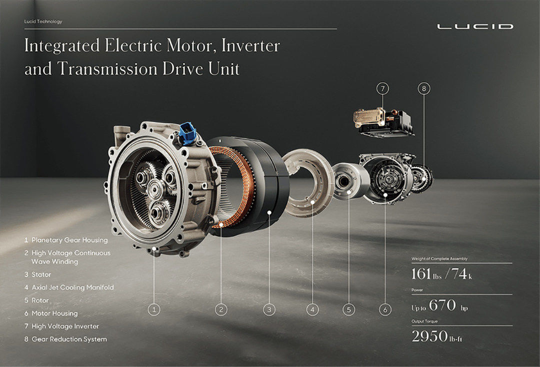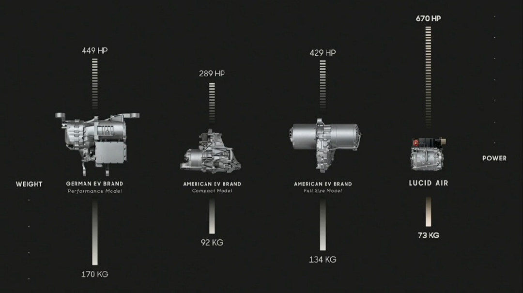 Lucid Air转速甚至能达到20000转,0-96km/h的加速时间仅为2.5s,极速可达378km/h。更为重要的一点是系统高度集成化,其永磁电机重量仅为73kg。