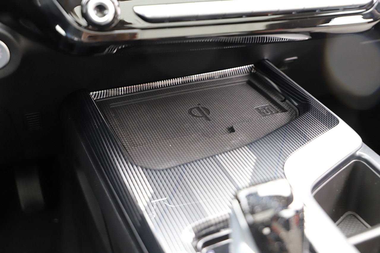 中控下方设置了一个非常宽大的无线充电区域,主流手机放下去没有任何问题。电源方面,有两个USB接口和一个12V电源,而且在无线充电区域还预留了给手机充电线走线的小孔,细节拉满!