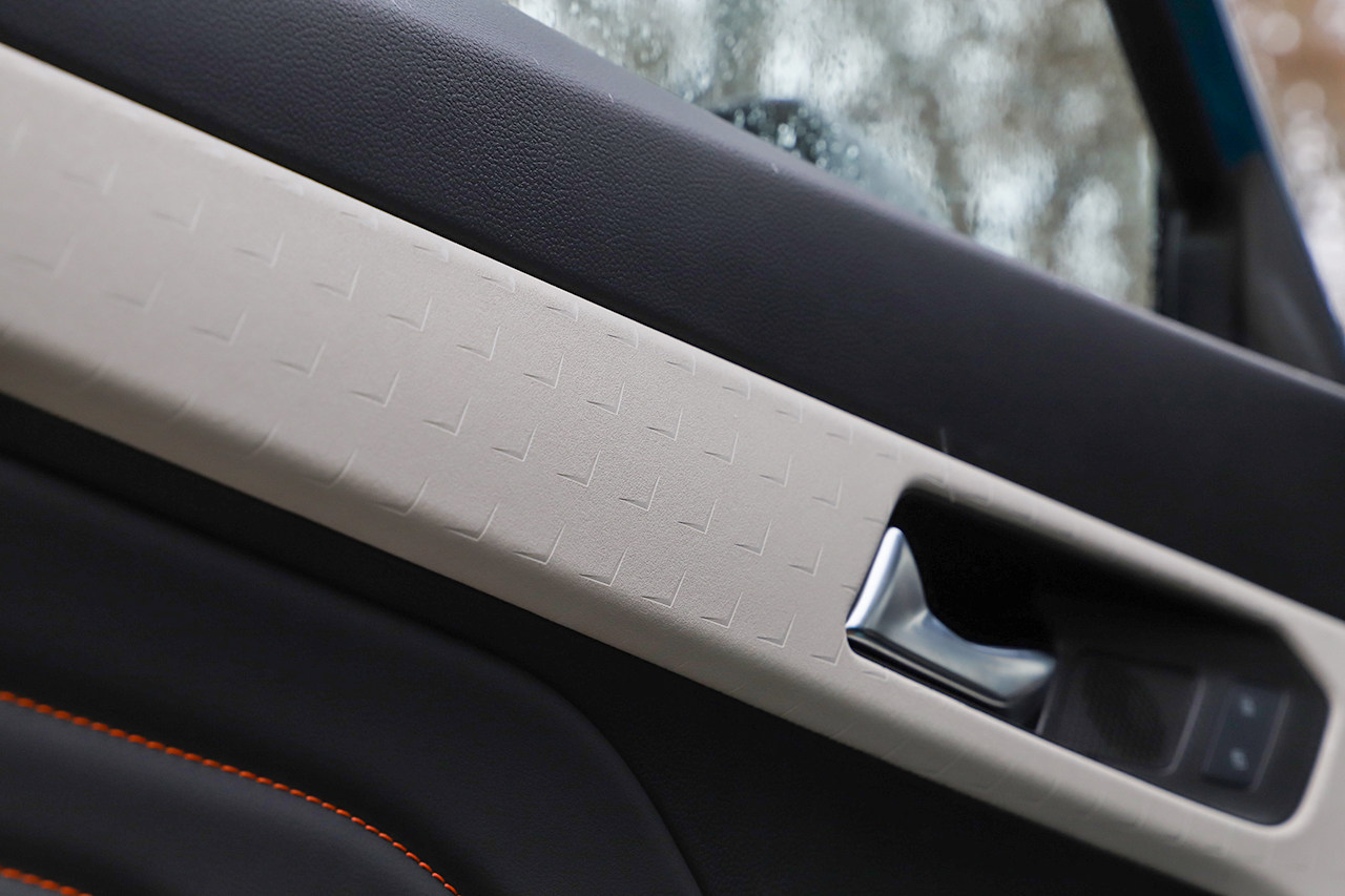 同样的设计元素也出现在车门内衬板上,很多时候我们会发现,中控如果元素很多,而车门上啥也没有,就会感觉“头重脚轻”,就会有种不协调的感觉,赤兔在这方面表现不错。