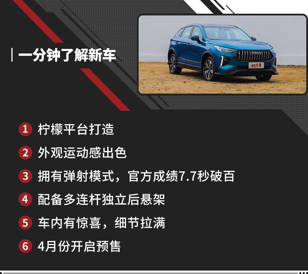 匹配的则是一台7速湿式双离合变速箱,官方给出的百公里加速成绩为7.7s,并且具有弹射起步功能,看来哈弗对这台变速箱的可靠性以及可承受扭矩还是有很大信心的。