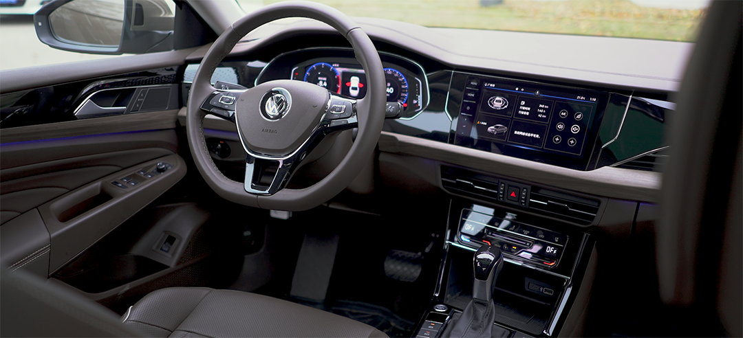 第一个出场的是帕萨特,它的内饰做工延续了大众一贯非常高的工艺水准,并且在用料的地方做得非常到位,细节十分丰富。车内较多的真皮包裹加上钢琴烤漆的饰板,配合座椅加热、通风、无线充电、氛围灯等配置,以及非常清晰、流畅、功能性丰富的9.2英寸中控屏,能够带来一个高级的享受。