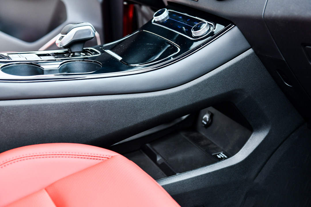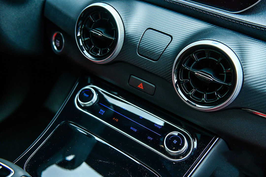 进入车内,红黑配色的设计,别具一格的方向盘和空调出风口设计突出车辆运动氛围。中控台使用大量软质材料包裹,下方则是仿碳纤维饰板,整体用料在同级别来看是很不错的。