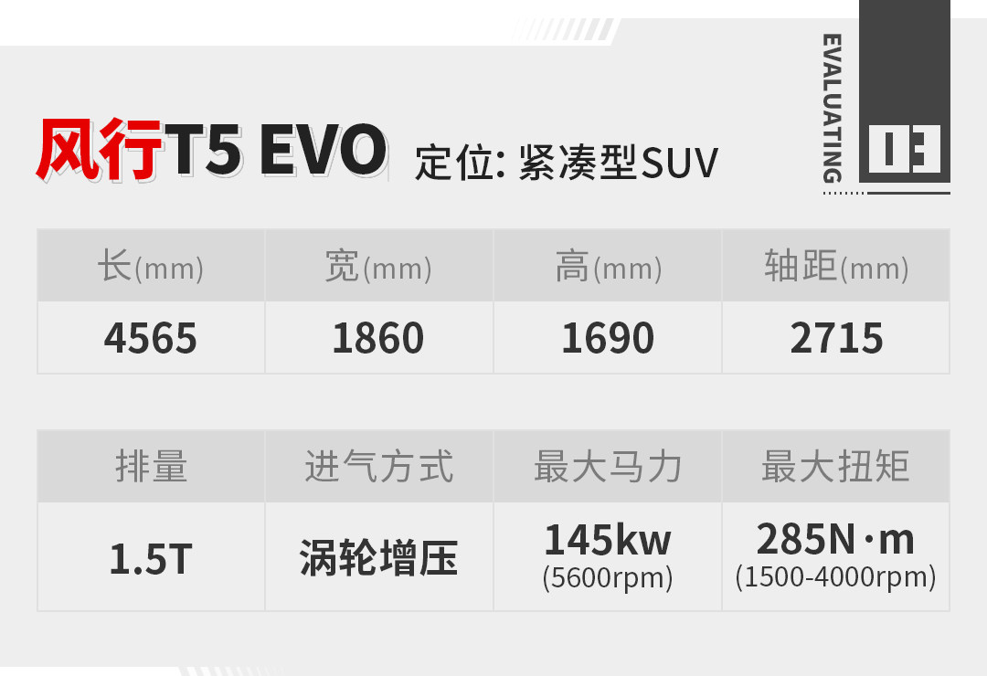 风行T5 EVO以“10万起售,30万享受”,全新的狮标,全新的形象,注定风行T5 EVO无法低调,同时该车也象征这东风风行品牌的全面计划,品牌形象的提升。漂亮的动力输出再加上相对成熟的调校,让风行T5 EVO成为同级别中的佼佼者。