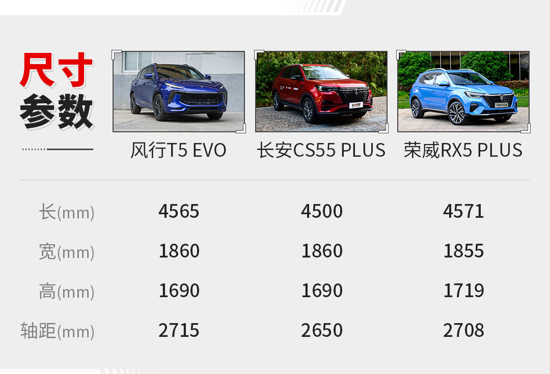 虽然在长度上东风风行T5 EVO不算特别占优,但在轴距上分别领先65mm和7mm将直接体现在车辆后排腿部空间上,而根据实际体验也是如此,在风行T5 EVO上能轻松翘起二郎腿,此时前排同样拥有优秀的腿部空间,而CS55 PLUS和RX5 PLUS会相对弱势一些。