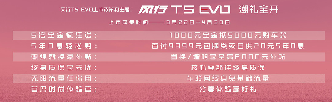 说说参数,风行T5 EVO使用一台来自三菱的代号为4A95TD的1.5T发动机,最大马力197Ps,最大扭矩285N·m,这样的参数在同级别来看也是数一数二的存在,排放符合国六标准。此外,在4月30日前订车,还可以享受核心零部件终身质保的政策!