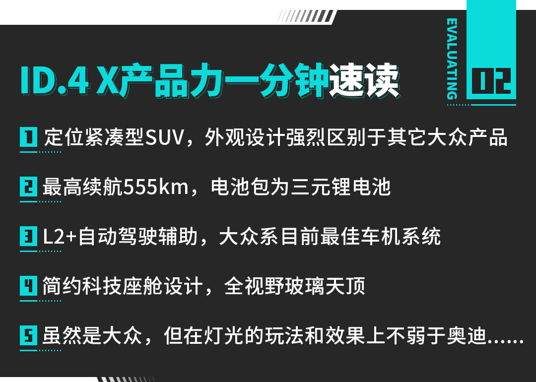 评价电动车的本质都不在产品本身,基础设施决定上层建筑,当路的远方没有充电桩时,一切体验都是玄学。但如果你是一位对生活很有规划的人,纯电车的使用瓶颈无法影响到你时,那就可以考虑一些更深层次的东西,这个时候很多新势力倡导的“尖端科技+颠覆体验”就会成为你所看重的。而上汽大众ID.4 X的突破口在于: