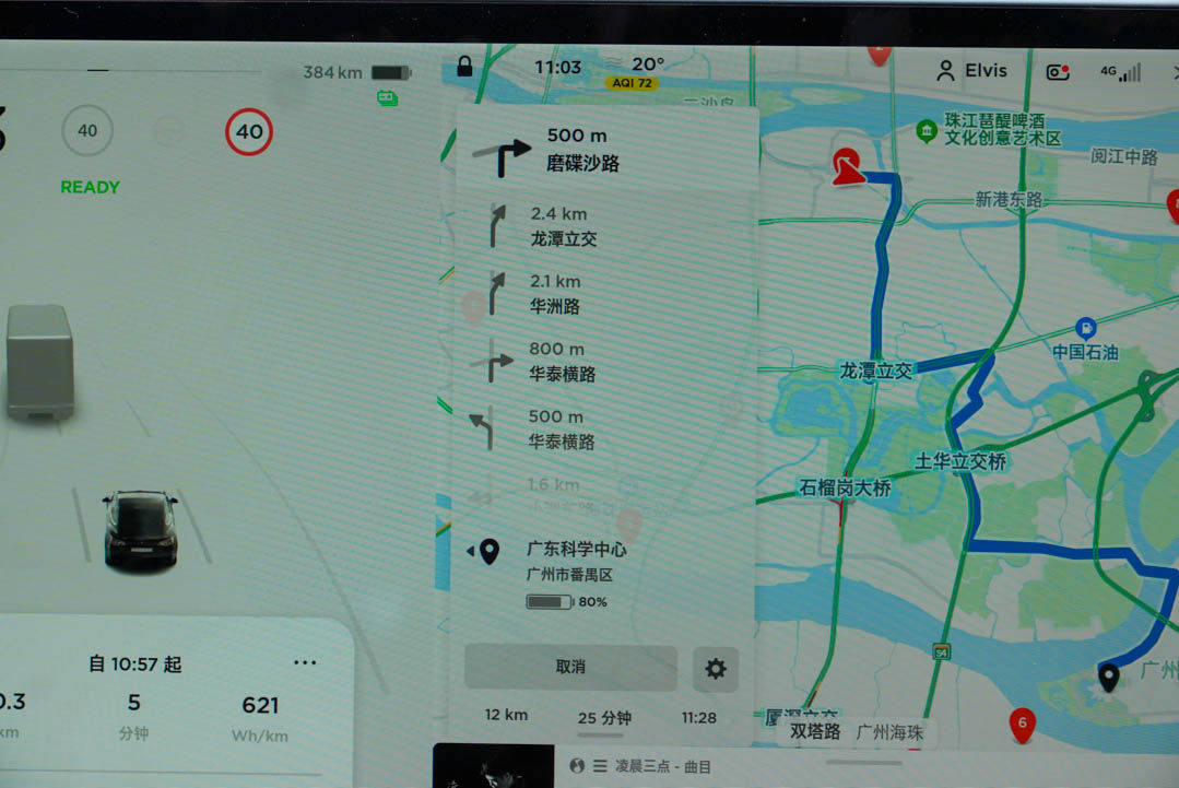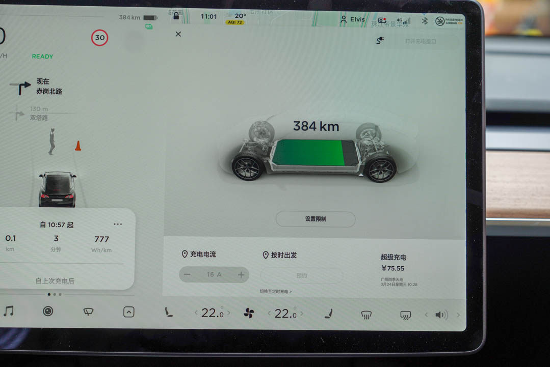 于是我们迅速在屏幕上查找最近的充电站,由于特斯拉早已意识到配套是关键,以广州举例,目前广州已经布局了数十座超级充电站,最高可提供250kw的充电功率,比市面主流的100kW电站高了不少。