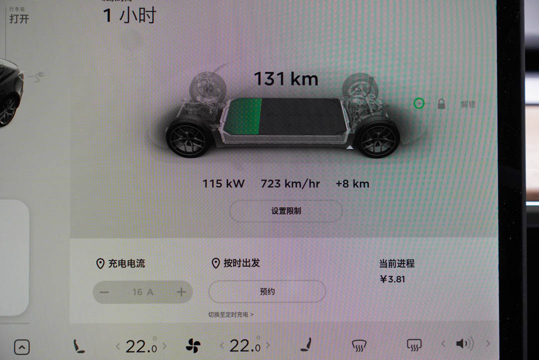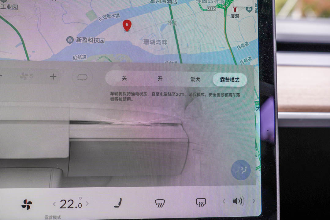 而且特斯拉还贴心的准备了露营模式的空调功能,由于电车的工作特性,即便是在地库长时间使用空调也不怕一氧化碳中毒,当然了电耗还是要注意的,设定为22度,实测使用半小时大约会掉5km的续航里程。