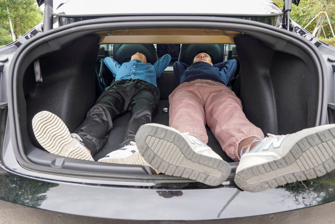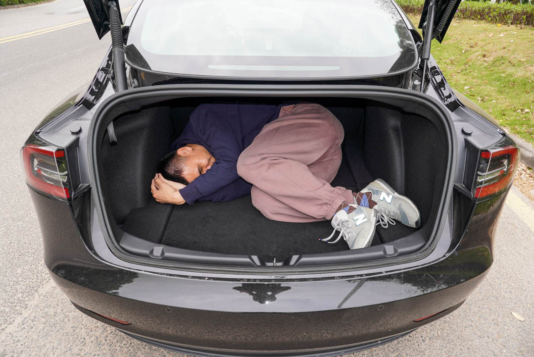 按照马斯克的说法,Model 3是一台六人车,我们的小哥进去测试了一下,果然是真的,或许特斯拉是这么想的:后排小,坐不下那就躺后备箱啊。